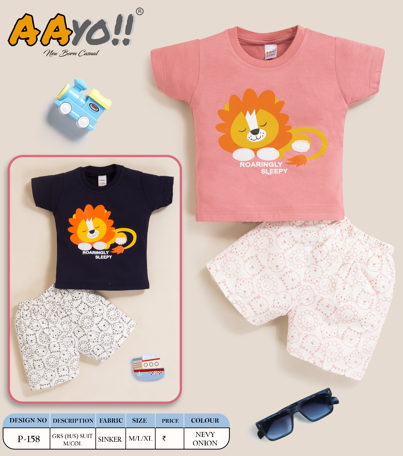 The AAYO “Roaringly Sleepy” Half Sleeve Kids Suit (Design P-158) is crafted from premium sinker cotton to ensure breathable comfort and softness for everyday wear. Featuring an adorable sleeping lion graphic on the top, this coordinated set combines playful style with practical design. The half-sleeve t-shirt provides ease of movement, while the matching printed shorts offer a relaxed and comfortable fit. Lightweight and skin-friendly, the fabric keeps children cool and comfortable throughout the day. Available in M, L, and XL sizes and offered in attractive Navy and Onion color options, this set is perfect for casual wear, lounging, or summer sleepwear.