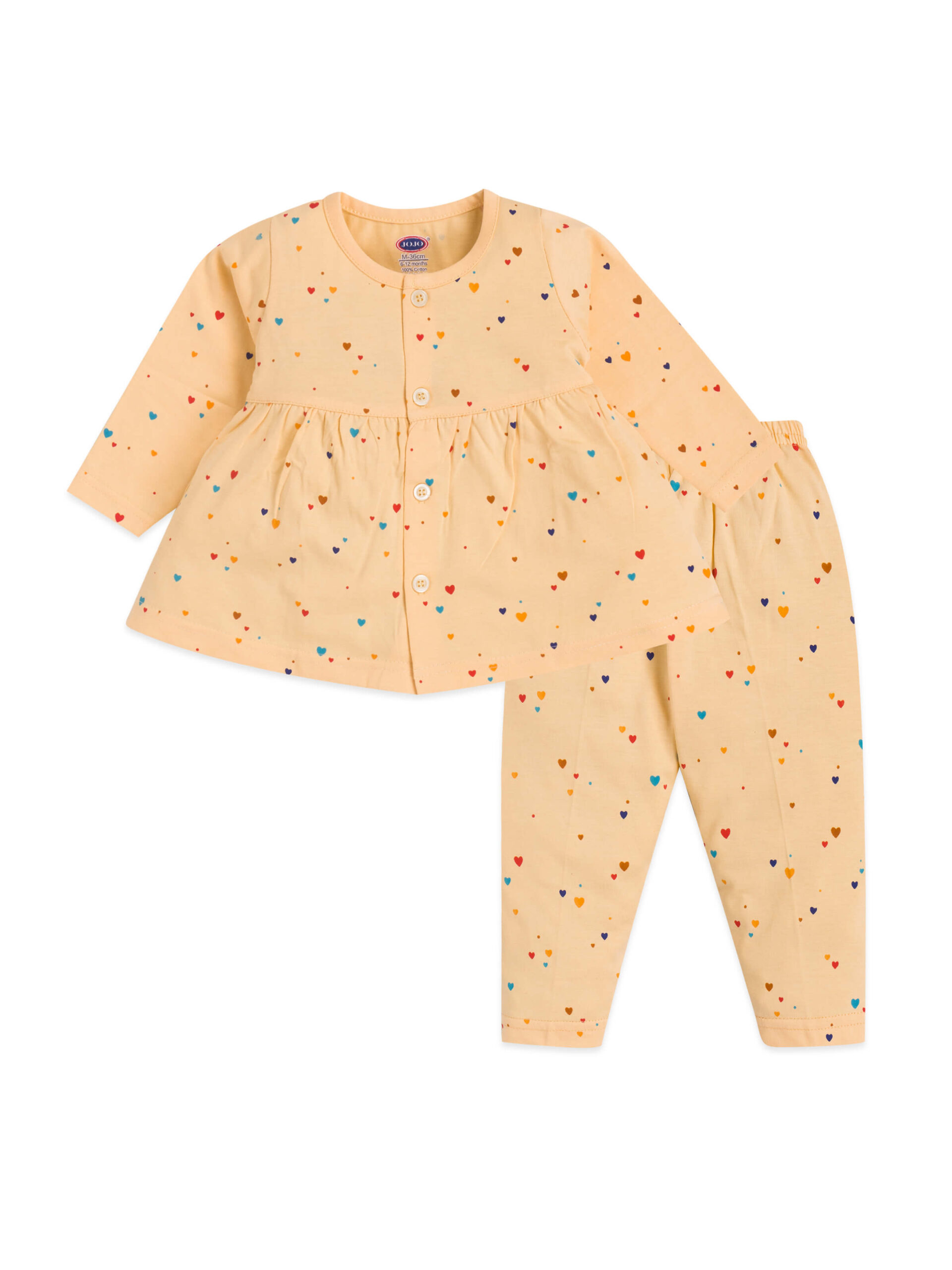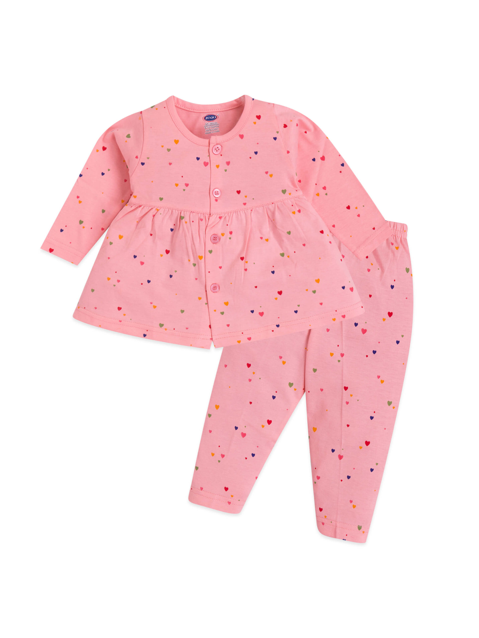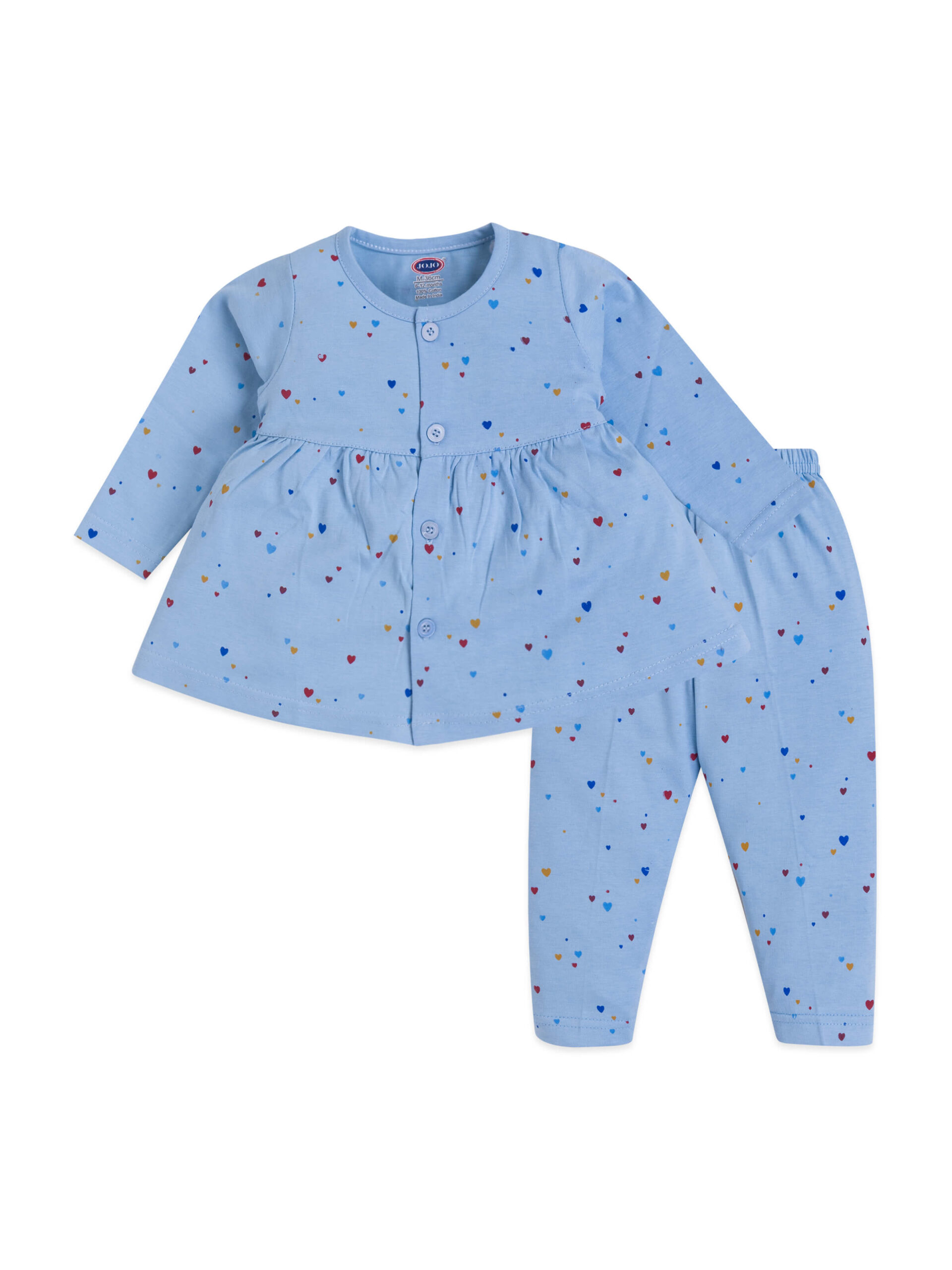 The entire frock suit is decorated with a colorful multicolored mini-heart print, giving the outfit a fun and lovable appeal. The playful hearts on solid pastel backgrounds make it sweet enough for outings and calm enough for home wear.