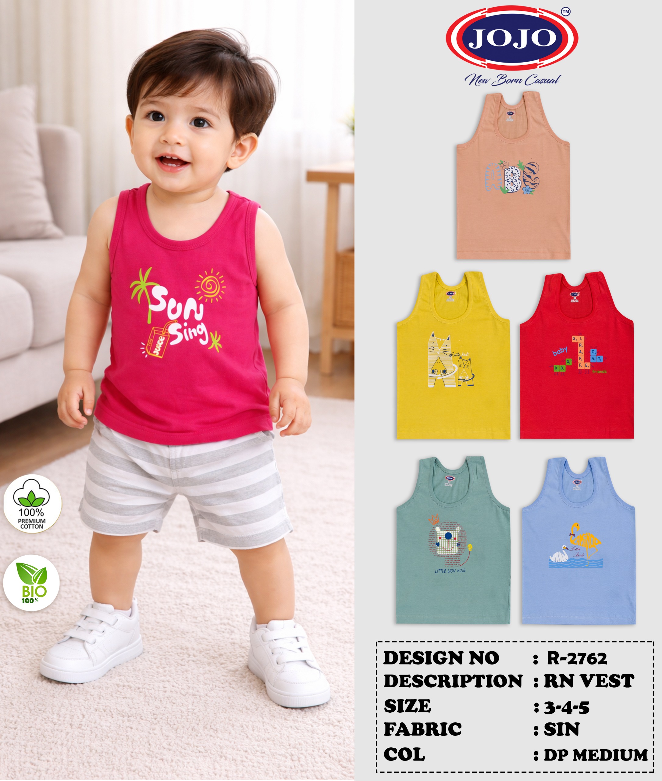 The JOJO Premium Cotton Boys Printed Round Neck Vest (Design R-2762) is crafted from high-quality cotton sinker fabric to provide superior softness, breathability, and comfort for active kids. Designed with a sleeveless round neck style, this vest ensures maximum airflow and freedom of movement, making it perfect for daily wear, playtime, and summer outings. Featuring attractive and playful graphic prints in deep and medium shades, it adds a fun touch to your child’s wardrobe. The skin-friendly, bio-safe fabric is gentle on delicate skin and maintains its shape and color after washing. Available in sizes 3-4-5 for a comfortable fit.
