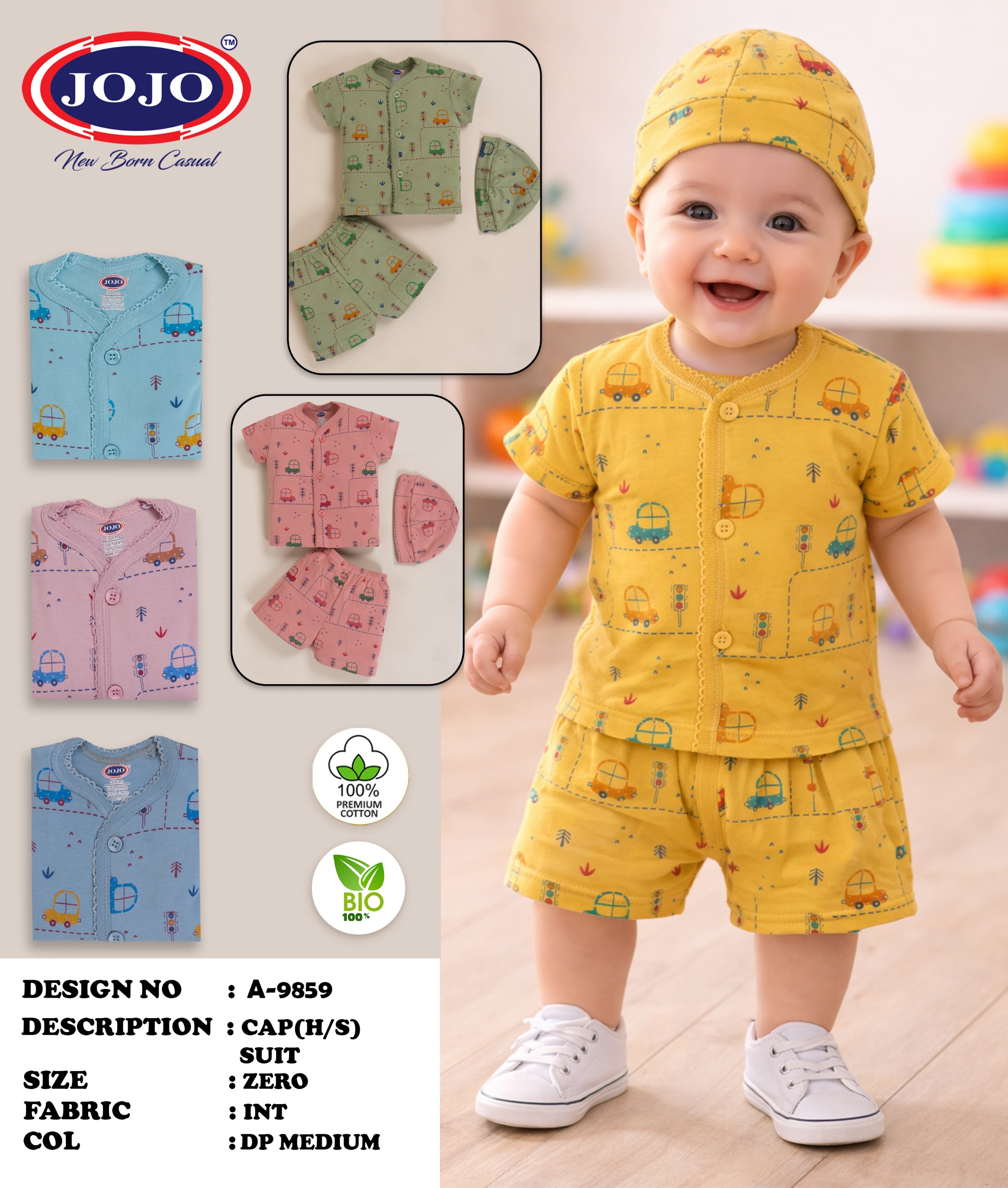 Dress your newborn in comfort and style with the JOJO 3-Piece Cap Suit Set. Made from 100% premium interlock cotton, this soft and breathable outfit is gentle on delicate baby skin. The set includes a half-sleeve button-down top, matching shorts, and a coordinating cap for a complete look.