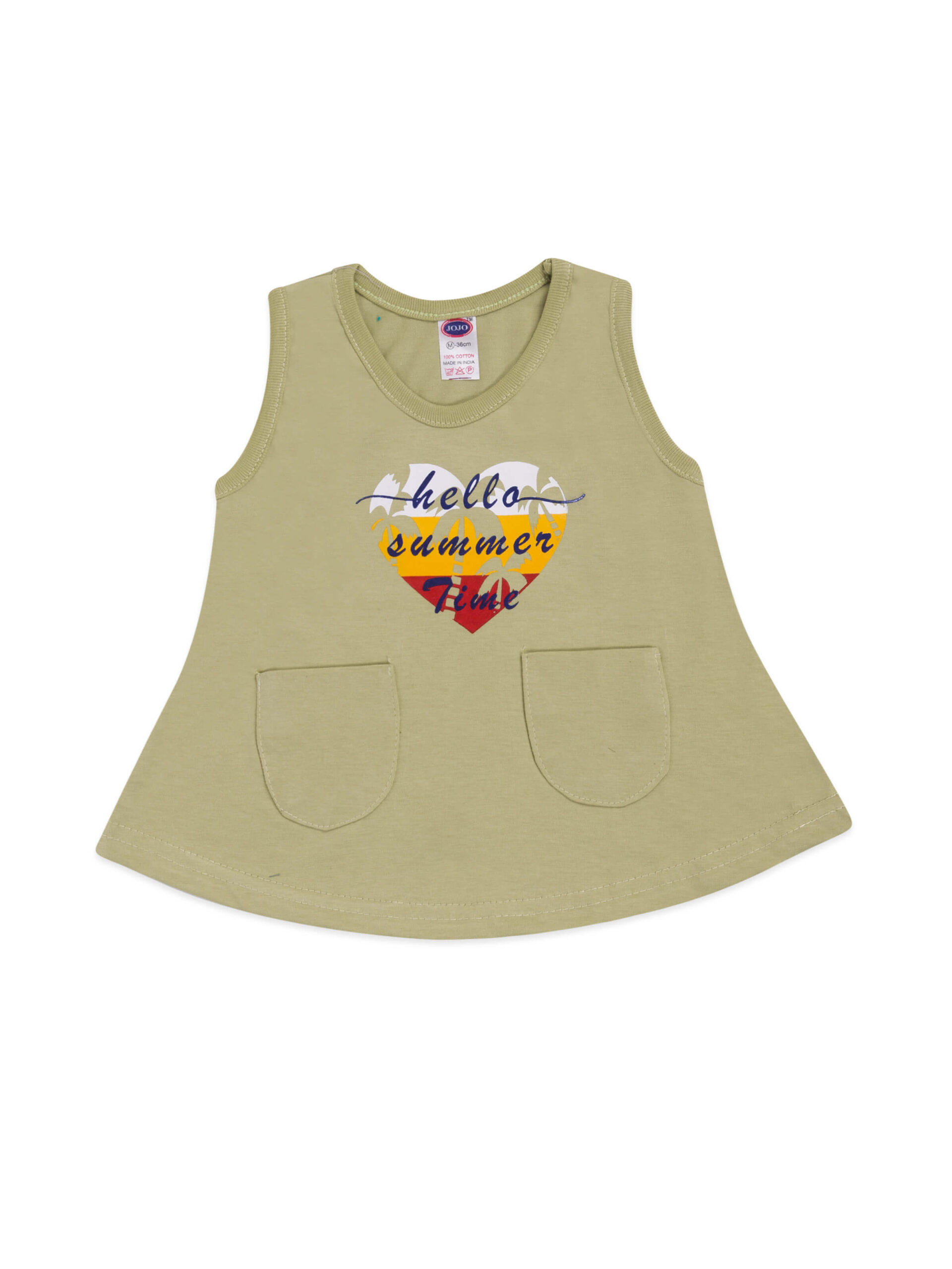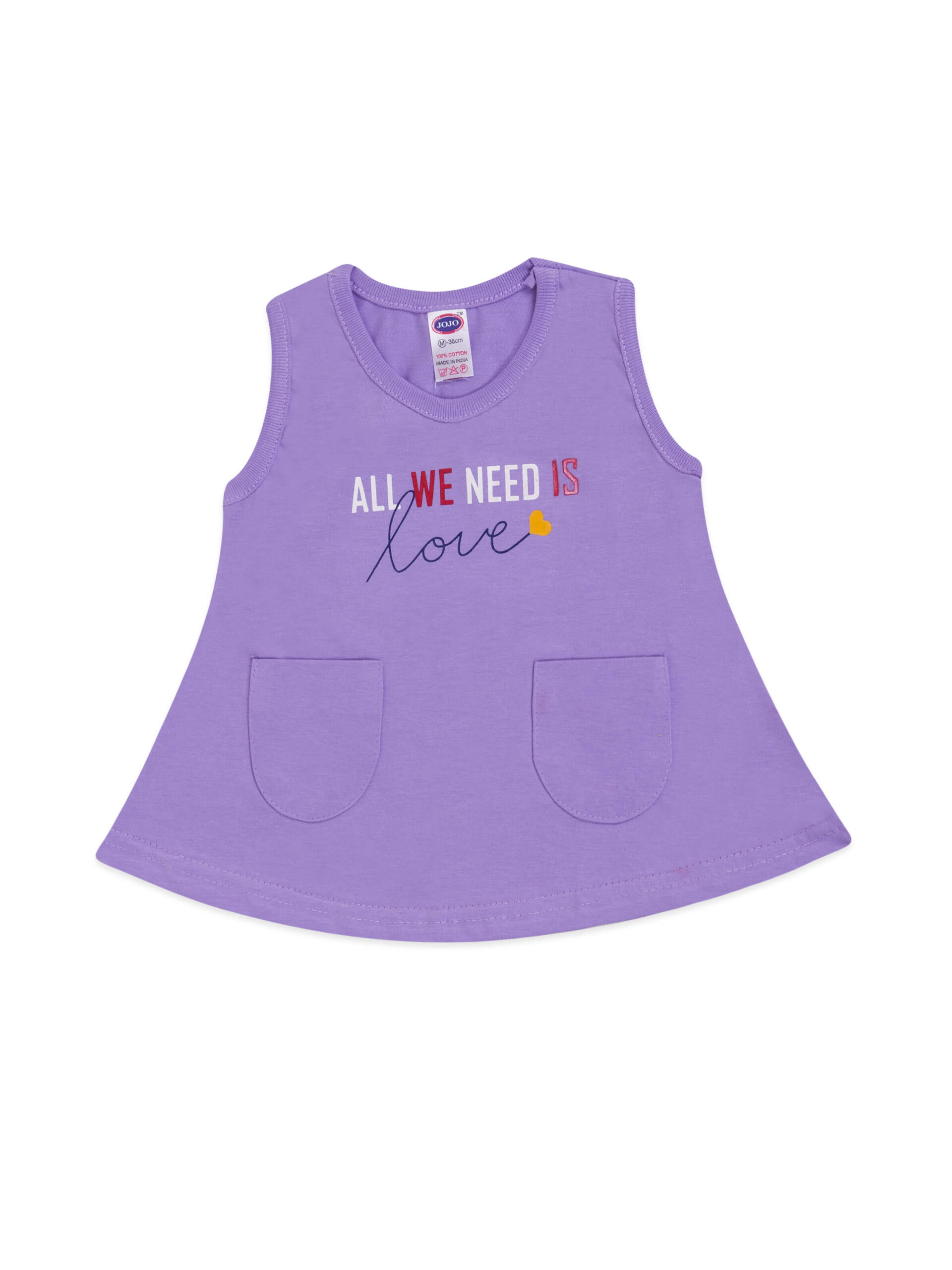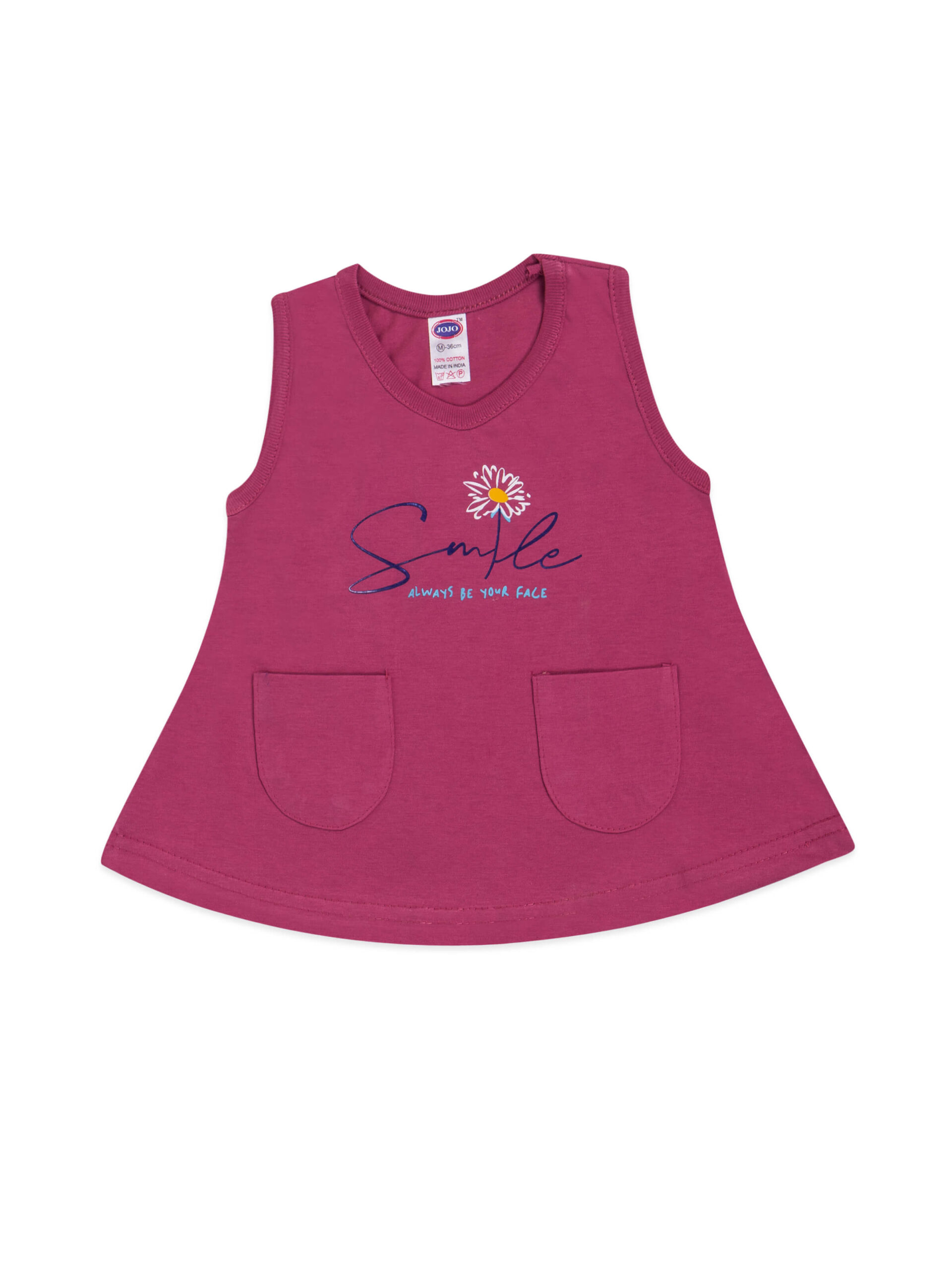 This sleeveless frock features an A-line cut that flares gently from the shoulders to the hem, providing excellent movement for busy toddlers. The round neck and knee-length finish make it a modest, comfortable choice for daily wear. The two front patch pockets add a playful, practical touch, ideal for storing tiny toys or just striking an adorable pose!